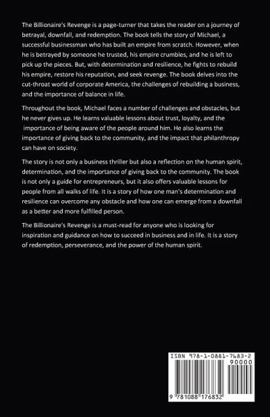 The Billionaire's Revenge is a page-turner that takes the reader on a journey of betrayal, downfall, and redemption. The book tells the story of Michael, a successful businessman who has built an empire from scratch. However, when he is betrayed by someone he trusted, his empire crumbles, and he is left to pick up the pieces. But, with determination and resilience, he fights to rebuild his empire, restore his reputation, and seek revenge. The book delves into the cut-throat world of corporate America, the challenges of rebuilding a business, and the importance of balance in life. Throughout the book, Michael faces a number of challenges and obstacles, but he never gives up. He learns valuable lessons about trust, loyalty, and the importance of being aware of the people around him. He also learns the importance of giving back to the community, and the impact that philanthropy can have on society. The story is not only a business thriller but also a reflection on the human spirit, determination, and the importance of giving back to the community. The book is not only a guide for entrepreneurs, but it also offers valuable lessons for people from all walks of life. It is a story of how one man's determination and resilience can overcome any obstacle and how one can emerge from a downfall as a better and more fulfilled person. The Billionaire's Revenge is a must-read for anyone who is looking for inspiration and guidance on how to succeed in business and in life. It is a story of redemption, perseverance, and the power of the human spirit.