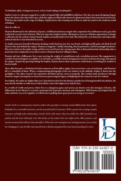 "A forbidden affair. A dangerous secret. A love worth risking everything for." Sophia Carter is a dreamer trapped in a reality of unpaid bills and unfulfilled ambitions. Her days are spent designing elegant gowns for clients who often fail to pay, while her nights are filled with visions of a glamorous future that seems just out of reach. With her tiny studio on the verge of collapse, Sophia knows she's running out of time to make her mark in the cutthroat world of fashion. Then he walks in. Damien Blackwood is the definition of power. A billionaire business mogul with a reputation for ruthlessness and a gaze that could melt even the iciest of hearts. When he steps into Sophia's studio, offering her a once-in-a-lifetime opportunity to design a collection for his exclusive luxury brand, Sophia can hardly believe her luck. But behind his cool demeanor and impeccably tailored suits lies a man shrouded in secrets. As Sophia immerses herself in Damien's dazzling world of private jets, five-star hotels, and high-profile galas, she finds herself drawn to the man behind the empire. Damien is magnetic-darkly charming, fiercely protective, and devastatingly handsome. His every touch sets her pulse racing, and his every word leaves her craving more. But as their professional relationship takes a passionate turn, Sophia discovers there's more to Damien than he's willing to share. Damien isn't just a billionaire; he's a man carrying the weight of a painful past and a scandalous present. His engagement to socialite Victoria Kingsley is as public as it is loveless, a carefully curated arrangement meant to maintain his image and expand his empire. Despite his growing feelings for Sophia, Damien knows their connection could destroy everything he's worked so hard to build. Their affair becomes a whirlwind of stolen moments and breathless nights, but secrets have a way of surfacing-and Damien's life is a minefield of them. When a compromising photograph of the two surfaces in the tabloids, Sophia is thrust into the spotlight as "the other woman," her reputation shredded and her career in jeopardy. The scandal sends shockwaves through Damien's empire, forcing him to choose between protecting his legacy and fighting for the woman he can't live without. For Sophia, the stakes are higher than ever. Torn between her love for Damien and the fear of losing herself in his shadow, she must decide whether to walk away or risk it all for a man who might never truly be hers. In a world of wealth and power, where love is a dangerous game and secrets can destroy even the strongest of hearts, The Billionaire's Secret Mistress is a steamy, emotional tale of passion, betrayal, and redemption. Will Damien and Sophia defy the odds and find a way to be together, or will the forces pulling them apart prove too strong to overcome?