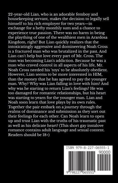 22-year-old Lian, who is an adorable femboy and housekeeping servant, makes the decision to legally sell himself to his rich employer for two years-in exchange for a hefty monthly sum and a chance to experience true passion. There was no harm in being the plaything of one of the wealthiest men in Arardosa Kingdom, right? But Lian quickly realizes that the intoxicatingly aggressive and domineering Noah Cross is a fractured man who was brutalized in the past. And Lian can't help but love every part of Mr. Cross. The man was becoming Lian's addiction. Because he was a man who craved control in all aspects of his life, Mr. Noah Cross needed his 'toys' to be absolutely obedient. However, Lian seems to be more interested in HIM, than the money that he has agreed to pay the younger man. Why? Why was Lian falling in love with him? And why was he starting to return Lian's feelings? He was too damaged for romantic relationships, but his heart was starting to yearn for the younger man. Lian and Noah soon learn that love plays by its own rules. Together the pair embark on a journey through the realms of dominance and submission as they sort out their feelings for each other. Can Noah learn to open up and trust Lian with the truths of his traumatic past as well as his delicate heart? (This short gay instalove erotic romance contains adult language and sexual content. Readers should be 18+)