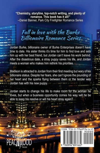 Jordan Burke, billionaire owner of Burke Enterprises doesn’t have time to date. His sister thinks it’s time for him to find love and sets him up with her best friend, but Jordan can’t leave his work behind. After the disastrous date, a stray puppy saves his life, and Jordan meets a woman who makes him rethink his priorities. Madison is attracted to Jordan from their first meeting but wary of his billionaire status. Despite her fears, she can’t ignore the pounding of her heart and the sparks flying between them or the tender way Jordan has with his new puppy. Jordan starts to change his life to make room for the woman he loves, but when a business opportunity comes his way, will he be able to keep his resolve or will his heart stray again?