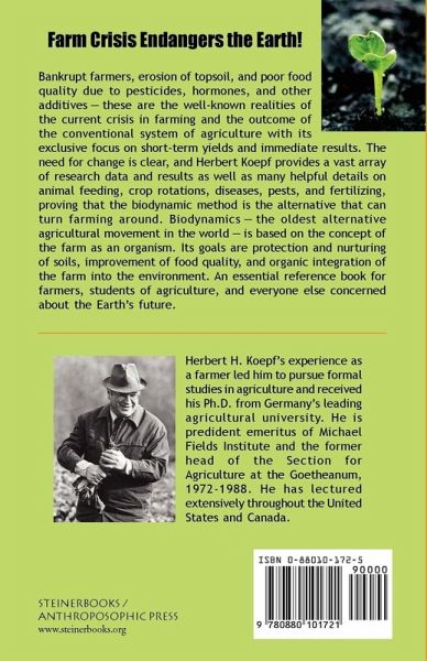 Bankrupt farmers, erosion of topsoil, and poor food quality owing to pesticides, hormones, and other additives--these are the well-known realities of the modern crisis in farming. This problem is the outcome of the limited vision of conventional methods and a system that focuses exclusively on quick results and profits. The need for change is clear, and Koepf provides a vast array of research data and results, as well as many helpful details on animal feeding, crop rotation, diseases, pests, and fertilizing. He shows that the biodynamic method of farming and gardening is the alternative that can turn farming around. Biodynamics is "the oldest alternative agricultural movement in the world." It is based on the concept of the whole farm as a single organism. Its goals are to protect and nurture the soil, improve the quality of food, and organically integrate the farm into the environment as a whole. This is an essential reference for all farmers who are unsatisfied with conventional methods and for gardeners who wish to improve the quality of life around them as well as the food they serve their families.