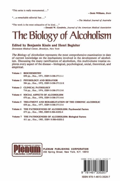 of Volume 7.- 1 Genetic Factors in Alcohol Abuse: Animal Models.- Animal Models in Alcohol Research.- A Quantitative Genetic Model.- Genetically Defined Populations in Alcohol Research.- Selective Breeding.- Summary.- References.- 2 Genetic Factors in Alcoholism.- Common Methodological Problems in Research on Genetic.- References.- 3 Acute Pharmacological Actions of Ethanol on the Central Nervous System.- Membranes.- Effects of Ethanol on Brain Calcium.- Membrane-dependent Neurotransmitter Activity.- Summary.- References.- 4 Ethanol and Brain Mechanisms of Reward.- Substrates of Brain Stimulation Reward.- Substrates of Drug Reward.- Interactions of Drugs of Abuse with Brain-Stimulation Reward.- Speculations.- References.- 5 Ethanol as a Reinforcer: Comparison with Other Drugs.- Intravenous Drugs as Reinforcers.- Intragastric Drug Self-administration.- Ethanol and Other Drugs as Reinforcers by the Oral Route.- Summary and Conclusions.- References.- 6 A Behavioral Analysis of the Reinforcing Properties of Alcohol and Other Drugs in Man.- Behavioral Effects of Alcohol and Drugs.- Control of Behavior by Aversive Consequences.- Substance Abuse: Similarities and Differences.- Conclusions.- References.- 7 Neurochemical Aspects of Tolerance to and Physical Dependence on Alcohol.- Definitions of Functional Tolerance and Dependence.- Factors Modulating Ethanol Tolerance Development.- Effects of Ethanol Administration on Neurotransmitters.- Neurotransmitter Receptors.- Role of Neuronal Membranes in Development of Tolerance and Dependence.- Role of Condensation Products in Ethanol Tolerance and Dependence.- Conclusions.- References.- 8 Metabolic Mechanisms in Tolerance and Physical Dependence on Alcohol.- Metabolic Tolerance.- Metabolism Mechanisms in Physical Dependence.- References.- 9 Endocrine Mechanisms in Tolerance to and Dependence on Alcohol.- Alcohol-Endocrine Interactions.- Conclusions.- References.- 10 The Relationship of Tolerance and Physical Dependence to Alcohol Abuse and Alcohol Problems.- A Consideration of the Regulation of Alcohol Consumption.- Tolerance.- Physical Dependence.- Implications for Prevention and Treatment.- Conclusion.- References.- 11 Brain Dysfunction and Alcohol.- Structural Brain Damage.- Evoked Potentials.- Concluding Remarks.- References.- 12 Cognitive Deficits in Alcoholics.- Short-term Effects of Alcohol Ingestion.- Long-term Effects of Alcohol Ingestion.- Theoretical Considerations.- References.- 13 Prenatal Effects of Alcohol Abuse in Humans and Laboratory Animals.- Historical Introduction to Alcohol Abuse in Pregnancy.- Intrauterine Effects of Maternal Alcohol Abuse in Humans.- Animal Models of Maternal Alcohol Use and Abuse.- The Importance of Fetal Alcohol Syndrome to Problems of Female Alcohol Abuse.- Conclusions.- References.- 14 Amethystic Agents in the Treatment of Alcohol Intoxication.- Available Antagonists of Centrally Active Drugs.- Putative Alcohol Antagonists.- Conclusions and Recommendations for Future Study.- References.