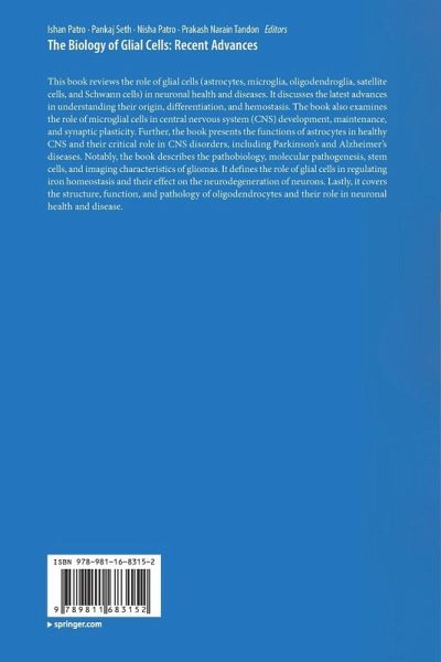 Chapter 1_Glial Biology: A Historical Perspective.- Chapter 2_. Basic Biology of Astrocytes.- Chapter 3_ Oligodendrocyte: Structure, Function and Pathology.- Chapter 4_ Oligodendroglial-astroglial cell-cell communication in the Central Nervous System.- Chapter 5_ Oligodendroglial Gap junction communication in CNS myelination and demyelination .- Chapter 6_ Generation and maturation of macroglia in central nervous system. - Chapter 7_ Origin and Development of Microglia.- Chapter 8_ Biology of Astrocytes in CNS Infection.- Chapter 9_ Role of reactive astrocytes in Alzheimer's disease.- Chapter 10_ Role of astrocyte dysfunction in Parkinson's Disease pathogenesis.- Chapter 11_ Astroglial Pathology in Major Depressive Disorders: Metabolic and Molecular Aspects.- Chapter 12_ Glia in epilepsy: an overview.- Chapter 13_ Tumors of the Glia: Recent Advances.- Chapter 14_ Astroglial iron homeostasis and neurodegenerative diseases.-Chapter 15_ Glial cells are Key Orchestrators of Neural degeneration in Basal Ganglia Disorders: Classical and Contemporary observations.- Chapter 16_ Interplay between microglia and astrocytes during neuroinflammation: Lessons learnt from in-vitro and in-vivo models of sporadic Amyotrophic Lateral Sclerosis.- Chapter 17_ Microglia orchestrate inflammation via HSP60 driven signaling pathway: a road map of molecular mechanism.- Chapter 18_ Biphasic Role of Microglia in Brain Health and Disease.- Chapter 19_ Multidimensional roles of Microglial Cells in Neuroviral Infections.- Chapter 20_ Microglia Aging.- Chapter 21_ Emerging Role of Satellite and Schwann Cells of Peripheral Neuroglial System in Nerve Repair.- Chapter 22_ Insights in the role of glia in mediating brain plasticity in health and disease.- Chapter 23_ The glial perspective of energy homeostasis, neuroinflammation and neuro-nutraceuticals.- Chapter 24_ Role of glia in Huntington's disease.- Chapter 25_ Endogenous mediators of neuroinflammation: The endocannabinoid system at the retina.- Chapter 26_ Drosophila melanogaster: An Immaculate Model for Glial Research.- Chapter 27_In-vitro models of Astrocytes: An Overview.
