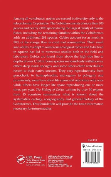 Among all vertebrates, gobies are second in diversity only to the teleost family Cyprinidae. The Gobiidae consists of more than 200 genera and nearly 2,000 species and make up the largest family of marine fishes. Gobies account for as much as 50% of the energy flow in coral reef communities. Their small size, ability to adapt to numerous ecological niches and to be bred in aquaria has led to numerous studies both in the field and laboratory. Gobies are found from above the high tide line to depths of over 1,100 m. Some species are found only within caves, others deep inside sponges, and some others climb waterfalls to return to their native streams. They vary reproductively from gonochoric to hermaphrodite, monogamy to polygyny and promiscuity, some have short life spans and reproduce only once while others have longer life spans reproducing one or more times per year. The Biology of Gobies written by over 30 experts from 15 countries summarizes what is known about the systematics, ecology, zoogeography, and general biology of the Gobiiformes. This foundation will provide the basic information necessary for future studies.