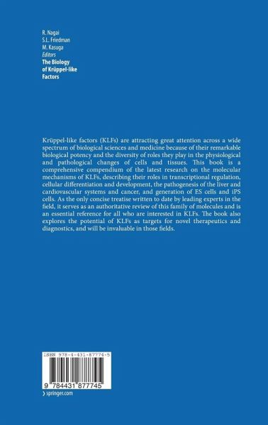 Kruppel-like factors (KLFs) are attracting great attention across a wide spectrum of biological sciences and medicine because of their remarkable biological potency and the diversity of roles they play in the physiological and pathological changes of cells and tissues. This book is a comprehensive compendium of the latest research on the molecular mechanisms of KLFs, describing their roles in transcriptional regulation, cellular differentiation and development, the pathogenesis of the liver and cardiovascular systems and cancer, and generation of ES cells and iPS cells. As the only concise treatise written to date by leading experts in the field, it serves as an authoritative review of this family of molecules and is an essential reference for all who are interested in KLFs. The book also explores the potential of KLFs as targets for novel therapeutics and diagnostics, and will be invaluable in those fields.