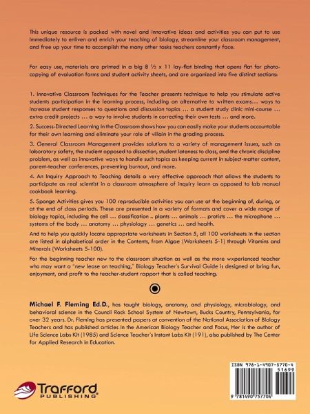 This unique resource is packed with novel and innovative ideas and activities you can put to use immediately to enliven and enrich your teaching of biology, streamline your classroom management, and free up your time to accomplish the many other tasks teachers constantly face. For easy use, materials are printed in a big 8 ¿ x 11 lay-flat binding that opens flat for photo-copying of evaluation forms and student activity sheets, and are organized into five distinct sections: 1. Innovative Classroom Techniques for the Teacher presents technique to help you stimulate active students participation in the learning process, including an alternative to written exams... ways to increase student responses to questions and discussion topics ... a student study clinic mini-course ... extra credit projects ... a way to involve students in correcting their own tests ... and more. 2. Success-Directed Learning in the Classroom shows how you can easily make your students accountable for their own learning and eliminate your role of villain in the grading process. 3. General Classroom Management provides solutions to a variety of management issues, such as laboratory safety, the student opposed to dissection, student lateness to class, and the chronic discipline problem, as well as innovative ways to handle such topics as keeping current in subject-matter content, parent-teacher conferences, preventing burnout, and more. 4. An Inquiry Approach to Teaching details a very effective approach that allows the students to participate as real scientist in a classroom atmosphere of inquiry learn as opposed to lab manual cookbook learning. 5. Sponge Activities gives you 100 reproducible activities you can use at the beginning of, during, or at the end of class periods. These are presented in a variety of formats and cover a wide range of biology topics, including the cell ... classification .. plants ... animals ... protists ... the microphone ... systems of the body ... anatomy ... physiology ... genetics ... and health. And to help you quickly locate appropriate worksheets in Section 5, all 100 worksheets in the section are listed in alphabetical order in the Contents, from Algae (Worksheets 5-1) through Vitamins and Minerals (Worksheets 5-100). For the beginning teacher new to the classroom situation as well as the more wxperienced teacher who may want a "new lease on teaching," Biology Teacher's Survival Guide is designed ot bring fun, enjoyment, and profit to the teacher-student rapport that is called teaching.