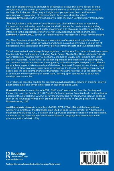 'The Bion Seminars at the A-Santamaria Association: Clinical and Theoretical Explorations is an enlightening and stimulating collection of chapters that delve deeply into the complexities of the human psyche as reflected in some of Wilfred Bion's most beautiful writings. Each chapter offers unique insights and perspectives that contribute to a comprehensive exploration of psychoanalytic theory and clinical practice. From the concept of the imaginary twin to negative capability and the concept of "transformation," this book navigates the intricacies of Bion's psychoanalysis with expertise and finesse. The contributors, Peter Goldberg, Tom Helscher, Afsaneh Alisobhani, Annie Reiner, Nicola Abel-Hirsch, Howard Levine, Antonia Grimalt, Avner Bergstein, and Joao Carlos Braga, offer perspectives and intuitions that challenge conventional wisdom and expand our understanding of the human experience. Whether exploring Bion's issues about the limits of language or the meaning of frustration, these chapters invite readers on a journey that will leave them with a passionate picture of one of the most original and thought-provoking writers in the history of psychoanalysis. This book is a valuable resource for clinicians, researchers, and anyone in the field of humanities interested in what psychoanalysis can tell us about the essence of our humanity.'
