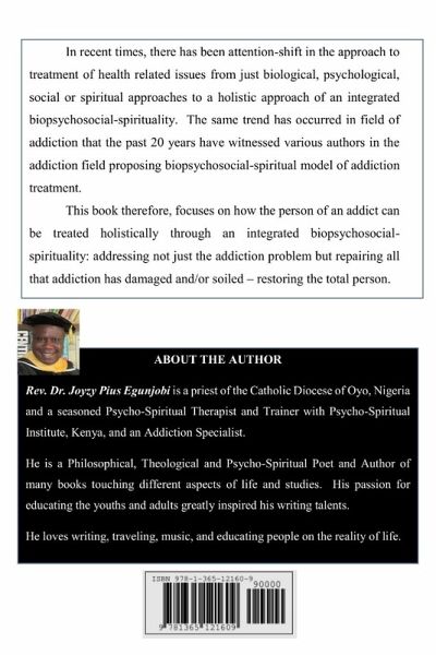 In recent times, there has been attention-shift in the approach to treatment of health related issues from just biological, psychological, social or spiritual approaches to a holistic approach of an integrated biopsychosocial-spirituality. The same trend has occurred in field of addiction that the past 20 years have witnessed various authors in the addiction field proposing biopsychosocial-spiritual model of addiction treatment. This book therefore, focuses on how the person of an addict can be treated holistically through an integrated biopsychosocial-spirituality: addressing not just the addiction problem but repairing all that addiction has damaged and/or soiled - restoring a total person.