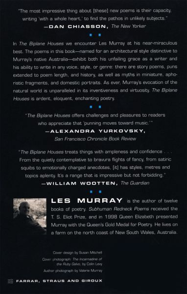 This is Les Murray's first new volume of poems since Poems the Size of Photographs in 2002. In it we find Murray at his nearmiraculous best. The collection-named for a kind of house distinctive to Murray's native Australia-exhibits both his unfailing grace as a writer and his ability to write in any voice, style, or genre: there are story poems, puns extended to poem length, history-and myths in miniature, aphoristic fragments, and domestic portraits. As ever, Murray's evocation of the natural world is unparalleled in its inventiveness and virtuosity. The Biplane Houses is ardent, eloquent, enchanting poetry.