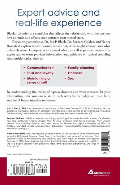 Bipolar is a condition that affects peoples' relationships with others as much as it affects their own mental state. When one person in a couple is experiencing the extreme highs and lows of a disorder like this one, it's impossible for their partner not to feel the strain too. Reassuring yet realistic, Dr. Bloch, Dr. Golden, and Nancy Rosenfeld explain what's normal, what's not, what might change, and what definitely won't. They provide information and advice on typical troubling relationship topics, such as: Communication Trust and loyalty Family planning Finances Sex Maintaining a sense of self By understanding the reality of bipolar and what it means for a relationship, couples will relate to each other better today and plan for a successful future together tomorrow.