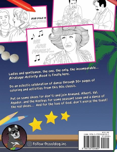 Ladies and gentlemen, the one, the only, the incomparable... Birdcage Activity Book is finally here. Do an eclectic celebration of dance through 30+ pages of coloring and activities from this 90s classic. The latest in the Cooldog Activity Book series features all your favorite scenes and quotes, so put on some shoes (or don't, if they make you fall down) and join Armand, Albert, Val, Agador, and the Keeleys for some peasant soup and a dance of the red shoes... And for the love of God, don't pierce the toast!