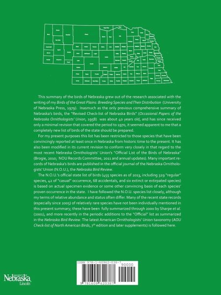 This summary of the birds of Nebraska has been restricted to those species that have been convincingly reported at least once in Nebraska from historic time to the present. It has also been modified in its current revision to conform very closely in that regard to the most recent Nebraska Ornithologists' Union's "Official List of the Birds of Nebraska" (Brogie, 2010; NOU Records Committee, 2011 and annual updates). The N.O.U.'s official state list of birds (455 species as of 2013, including 329 "regular" species, 42 of "casual" occurrence, 68 accidentals, and six extinct or extirpated species) is based on actual specimen evidence or some other convincing basis of each species' proven occurrence in the state. I have followed the N.O.U. species list closely, although my terms of relative abundance and status often differ. The latest American Ornithologists' Union taxonomy (AOU Check-list of North American Birds, 7th edition and later supplements) is followed here.
