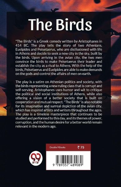 "The Birds" is a Greek comedy written by Aristophanes in 414 BC. The play tells the story of two Athenians, Euelpides and Peisetaerus, who are disillusioned with life in Athens and decide to seek a new city in the sky, built by the birds. Upon arriving in the avian city, the two men convince the birds to make Peisetaerus their leader and establish the city as a rival to Athens. With the help of the birds, Peisetaerus and Euelpides are able to make demands on the gods and control the affairs of men on earth. The play is a satire on Athenian politics and society, with the birds representing a new ruling class that is corrupt and self-serving. Aristophanes uses humor and wit to critique the political and social institutions of Athens, while also offering a vision of a better society that is built on cooperation and mutual respect. "The Birds" is also notable for its imaginative and surreal depiction of the avian city, which has inspired artists and writers throughout the ages. The play is a timeless masterpiece that continues to be studied and performed to this day, and its themes of power, corruption, and the human desire for a better world remain relevant in the modern age.