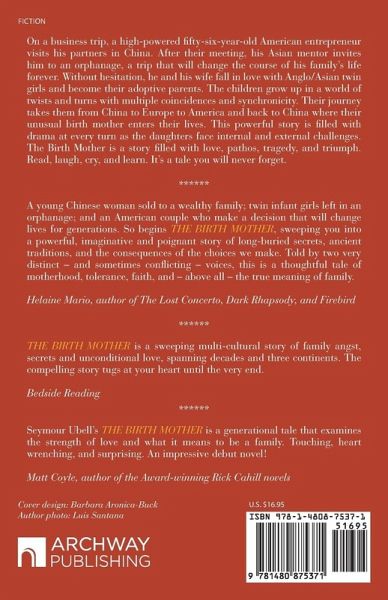 On a business trip, a high-powered fifty-six-year-old American entrepreneur visits his partners in China. After their meeting, his Asian mentor invites him to an orphanage, a trip that will change the course of his family's life forever. Without hesitation, he and his wife fall in love with Anglo/Asian twin girls and become their adoptive parents. The children grow up in a world of twists and turns with multiple coincidences and synchronicity. Their journey takes them from China to Europe to America and back to China where their unusual birth mother enters their lives. This powerful story is filled with drama at every turn as the daughters face internal and external challenges. The Birth Mother is a story filled with love, pathos, tragedy, and triumph. Read, laugh, cry, and learn. It's a tale you will never forget.