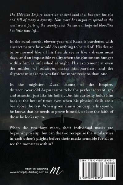 The Eldovian Empire covers an ancient land that has seen the rise and fall of many a dynasty. Now word has begun to spread in the most secret parts of the country that the current Imperial bloodline has little time left... In the rural north, eleven-year-old Rassa is burdened with a secret nature he would do anything to be rid of. His desire to be normal like all his friends seems like a dream most days, and an impossible reality when the gluttonous hunger within him is unleashed at night. His excitement at even the mildest of solutions makes him careless, and the slightest mistake proves fatal for more reasons than one. In the mightiest Ducal House of the Empire, thirteen-year-old Aegin trains to be the perfect servant, spy and assassin, just like his father. But his curiosity holds him back at the best of times even when his physical skills are a bar above the rest. When given a mission despite his youth, he knows that he needs to prove himself, or lose the faith of those he looks up to. When the two boys meet, their individual masks are beginning to slip, but can the two recognise the similarities in each other's plights before their masks crumble for all to see the monsters within?