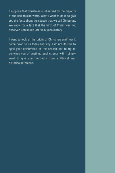 I suppose that Christmas is observed by the majority of the non-Muslim world. What I want to do is to give you the facts about the season that we call Christmas. We know for a fact that the birth of Christ was not observed until much later in human history. I want to look at the origin of Christmas and how it came down to us today and why. I do not do this to spoil your celebration of the season nor to try to convince you of anything against your will. I simply want to give you the facts from a Biblical and historical reference.