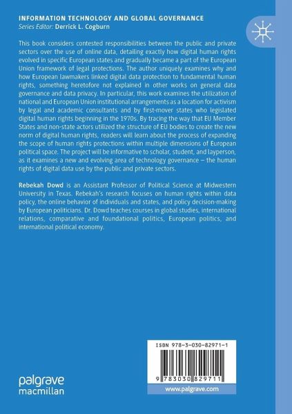This book considers contested responsibilities between the public and private sectors over the use of online data, detailing exactly how digital human rights evolved in specific European states and gradually became a part of the European Union framework of legal protections. The author uniquely examines why and how European lawmakers linked digital data protection to fundamental human rights, something heretofore not explained in other works on general data governance and data privacy. In particular, this work examines the utilization of national and European Union institutional arrangements as a location for activism by legal and academic consultants and by first-mover states who legislated digital human rights beginning in the 1970s. By tracing the way that EU Member States and non-state actors utilized the structure of EU bodies to create the new norm of digital human rights, readers will learn about the process of expanding the scope of human rights protections within multipledimensions of European political space. The project will be informative to scholar, student, and layperson, as it examines a new and evolving area of technology governance - the human rights of digital data use by the public and private sectors.