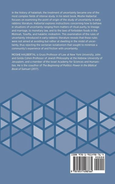 In the history of halakhah, the treatment of uncertainty became one of the most complex fields of intense study. In his latest book, Moshe Halbertal focuses on examining the point of origin of the study of uncertainty in early rabbinic literature, including the Mishnah, Tosefta, and halakhic midrashim. Halbertal explores instructions concerning how to behave in situations of uncertainty ranging from matters of ritual purity, to lineage and marriage, to monetary law, and to the laws of forbidden foods. This examination of the rules of uncertainty reveals that these rules were not aimed at avoiding but rather at dwelling in the midst of uncertainty.