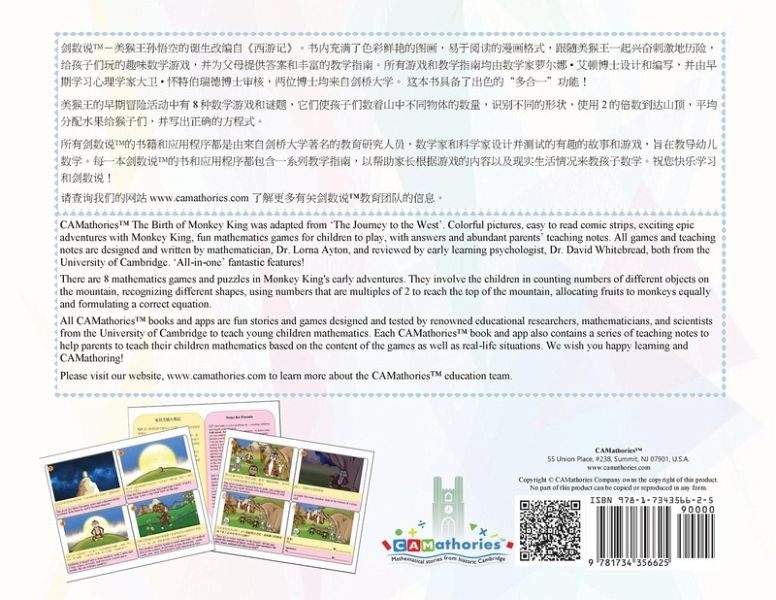 CAMathories(TM) The Birth of Monkey King was adapted from "The Journey to the West". Colorful pictures, easy to read comic strips, exciting epic adventure with Monkey King, fun math games for children to play, and comes with answers and abundant parents' teaching notes. All games and teaching notes are designed and written by Mathematician Dr. Lorna Ayton and reviewed by early learning psychologist, Dr. David Whitebread, both from the University of Cambridge. "All-in-one" fantastic features! There are 8 mathematics games and puzzles in Monkey King's early adventure, and they involve the children in counting numbers of different objects in the mountain, recognizing different shapes, using numbers that are multiples of 2 to reach the top of the mountain, and allocating fruits to monkeys equally and formulating a correct equation. Each CAMathories(TM) book and app contains a series of teaching notes to help parents to teach their children mathematics based on the content of the games as well as real-life situation. Wish you happy learning and CAMathoring! 剑数说(TM)-美猴王孙悟空的诞生改编自《西游记》。书内充满了色彩鲜艳的图画,易于阅读的漫画格式,跟随美猴王一起兴奋刺激地历险,给孩子们玩的趣味数学游戏,并为父母提供答案和丰富的教学指南。所有游戏和教学指南均由数学家萝尔娜 - 艾顿博士设计和编写,并由早期学习心理学家大卫 - 怀特伯瑞德博士审核,两位博士均来自剑桥大学。 "这本书具备了出色的"多合一"功能!美猴王的早期冒险活动中有8种数学游戏和谜题,它们使孩子们数着山中不同物体的数量,识别不同的形状,使用2的倍数到达山顶,平均分配水果给猴子们,并制定正确的方程式。每一本剑数说(TM)的书和应用程序都包含一系列教学指南,以帮助家长根据游戏的内容以及现实生活情况来教孩子数学。祝您快乐学习和剑数说!