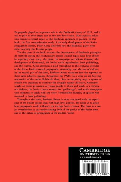 In this first comprehensive study of the early development of the Soviet propaganda system, Peter Kenez describes how the Bolshevik Party went about reaching the Russian people. Throughout he is more concerned with the experience of the Soviet people than with high-level politics. The book is both a major contribution to our understanding of the genius of the Soviet state, and of the nature of propaganda in the modem world.