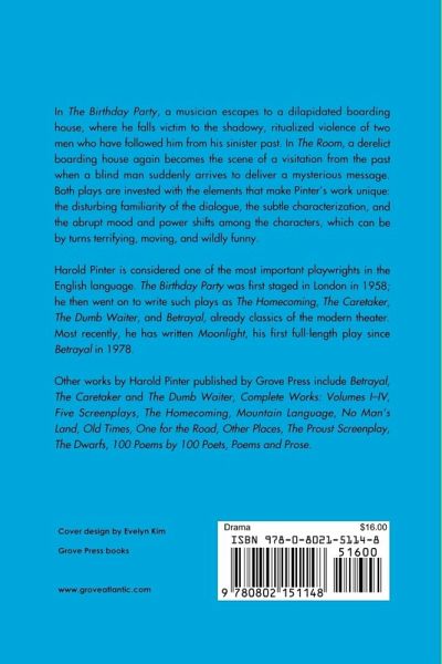 In The Birthday Party, a musician escapes to a dilapidated boarding house, where he falls victim to the shadowy, ritualized violence of two men who have followed him from his sinister past. In The Room, a derelict boarding house again becomes the scene of a visitation from the past when a blind man suddenly arrives to deliver a mysterious message. Both plays are invested with the elements that make Pinter's work unique: the disturbing familiarity of the dialogue, the subtle characterization, and the abrupt mood and power shifts among the characters, which can be by turns terrifying, moving, and wildly funny.