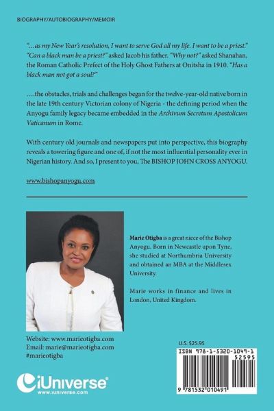 "…as my New Year’s resolution, I want to serve God all my life. I want to be a priest." "Can a black man be a priest?" asked Jacob his father. "Why not?" asked Shanahan, the Roman Catholic Prefect of the Holy Ghost Fathers at Onitsha in 1910. "Has a black man not got a soul?" ….the obstacles, trials and challenges began for the twelve-year-old native born in the late 19th century Victorian colony of Nigeria - the defining period when the Anyogu family legacy became embedded in the Archivum Secretum Apostolicum Vaticanum in Rome. With century old journals and newspapers put into perspective, this biography reveals a towering figure and one of, if not the most influential personality ever in Nigerian history. And so, I present to you, The BISHOP JOHN CROSS ANYOGU. www.bishopanyogu.com
