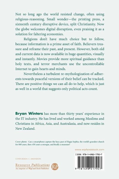 Not so long ago the world resisted change, often using religious-reasoning. Small wonder--the printing press, a sixteenth century disruptive device, split Christianity. Now the globe welcomes digital disruption, even praising it as a solution for faltering economies. Religions don't have much choice but to follow, because information is a prime asset of faith. Believers treasure and reframe their past, and present. However, both old and current data is now available in huge quantities, visually and instantly. Movies provide more spiritual guidance than holy texts, and terror merchants use the uncontrollable Internet to gain hearts and minds. Nevertheless a turbulent re-mythologization of adherents towards peaceful versions of their belief can be tracked. There are positive things we can all do to help, which is just as well in a world that suggests only political acts count. Bryan Winters has more than thirty years' experience in the IT industry, across several continents. He has lived and worked among both poor and rich Muslims in Africa and Asia. He and his wife, Rosie, live in a beachside community in New Zealand where he is known as an aging surfer.