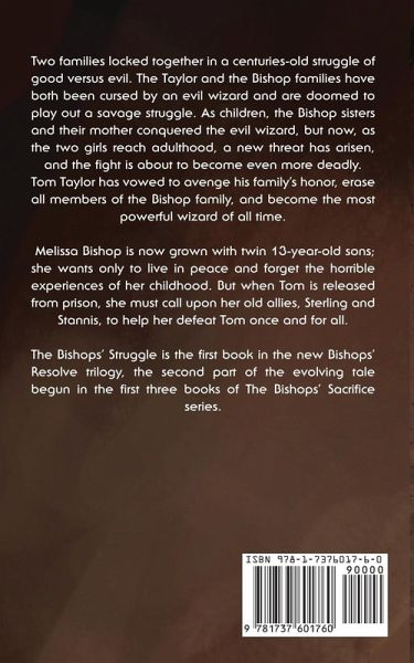 Two families locked together in a centuries-old struggle of good versus evil. The Taylor and the Bishop families have both been cursed by an evil wizard and are doomed to play out a savage struggle. As children, the Bishop sisters and their mother conquered the evil wizard, but now, as the two girls reach adulthood, a new threat has arisen, and the fight is about to become even more deadly.Tom Taylor has vowed to avenge his family's honor, erase all members of the Bishop family, and become the most powerful wizard of all time. Melissa Bishop is now grown with twin 13-year-old sons; she wants only to live in peace and forget the horrible experiences of her childhood. But when Tom is released from prison, she must call upon her old allies, Sterling and Stannis, to help her defeat Tom once and for all. The Bishops' Struggle is the first book in the new Bishops' Resolve trilogy, the second part of the evolving tale begun in the first three books of The Bishops' Sacrifice series.