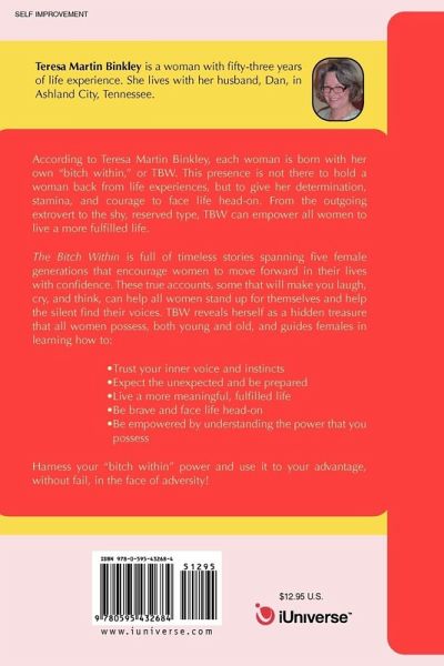 According to Teresa Martin Binkley, each woman is born with her own "bitch within," or TBW. This presence is not there to hold a woman back from life experiences, but to give her determination, stamina, and courage to face life head-on. From the outgoing extrovert to the shy, reserved type, TBW can empower all women to live a more fulfilled life. The Bitch Within is full of timeless stories spanning five female generations that encourage women to move forward in their lives with confidence. These true accounts, some that will make you laugh, cry, and think, can help all women stand up for themselves and help the silent find their voices. TBW reveals herself as a hidden treasure that all women possess, both young and old, and guides females in learning how to: Trust your inner voice and instincts Expect the unexpected and be prepared Live a more meaningful, fulfilled life Be brave and face life head-on Be empowered by understanding the power that you possess Harness your "bitch within" power and use it to your advantage, without fail, in the face of adversity!