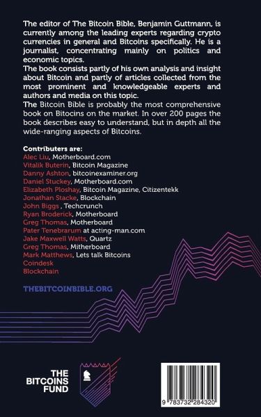 The editor of The Bitcoin Bible, Benjamin Guttmann, is currently among the leading experts regarding crypto currencies in general and Bitcoins specifically. He is a journalist, concentrating mainly on politics and economic topics.The book consists partly of his own analysis and insight about Bitcoin and partly of articles collected from the most prominent and knowledgeable experts and authors and media on this topic.