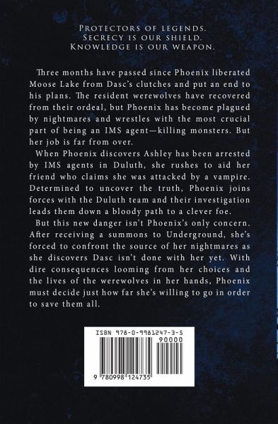 Three months have passed since Phoenix liberated Moose Lake from Dasc's clutches and put an end to his plans. The resident werewolves have recovered from their ordeal, but Phoenix has become plagued by nightmares and wrestles with the most crucial part of being an IMS agent--killing monsters. But her job is far from over. When Phoenix discovers Ashley has been arrested by IMS agents in Duluth, she rushes to aid her friend who claims she was attacked by a vampire. Determined to uncover the truth, Phoenix joins forces with the Duluth team and their investigation leads them down a bloody path to a clever foe. But this new danger isn't Phoenix's only concern. After receiving a summons to Underground, she's forced to confront the source of her nightmares as she discovers Dasc isn't done with her yet. With dire consequences looming from her choices and the lives of the werewolves in her hands, Phoenix must decide just how far she's willing to go in order to save them all.