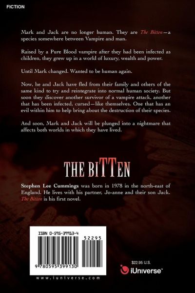 Mark and Jack are no longer human. They are The Bitten-a species somewhere between Vampire and man. Raised by a Pure Blood vampire after they had been infected as children, they grew up in a world of luxury, wealth and power. Until Mark changed. Wanted to be human again. Now, he and Jack have fled from their family and others of the same kind to try and reintegrate into normal human society. But soon they discover another survivor of a vampire attack, another that has been infected, cursed-like themselves. One that has an evil within him to help bring about the destruction of their species. And soon, Mark and Jack will be plunged into a nightmare that affects both worlds in which they have lived.