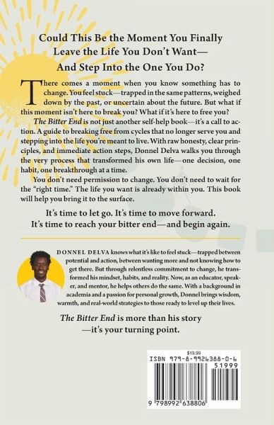 The Bitter End: How to Leave the Undesired Behind and Live the Life You Want is your guide to transforming your life. Written by Donnel Delva, this book offers practical steps to help you break free from negative patterns and create the life you've always wanted-full of happiness, abundance, and success. Through actionable advice, real-life strategies, and self-reflection exercises, Delva provides a clear roadmap for personal transformation. The Bitter End shows you how to understand your current state, define your desired state, and take the necessary steps to make lasting change. Whether you're feeling stuck, unsatisfied with your current circumstances, or simply want to level up, this book will help you create a life full of purpose and fulfillment. With immediate action steps after each chapter, you can start applying what you learn right away. Key Features:Step-by-step guidance for personal transformation. Practical exercises to gain clarity about your goals. Immediate Action Steps to implement what you've learned. Real-world examples to inspire and motivate. Research-based insights to back up the strategies. If you're ready to leave behind the undesired and step into a future full of possibility, The Bitter End will show you how. It's time to embrace change and live the life you deserve.