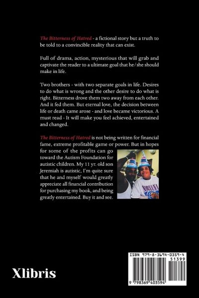 The Bitterness of Hatred - a fictional story but a truth to be told to a convincible reality that can exist. Full of drama, action, mysterious that will grab and captivate the reader to a ultimate goal that he/she should make in life. Two brothers - with two separate goals in life. Desires to do what is wrong and the other desire to do what is right. Bitterness drove them two away from each other. And it fed them. But eternal love, the decision between life or death came arose - and love became victorious. A must read - It will make you feel achieved, entertained and changed. The Bitterness of Hatred is not being written for financial fame, extreme profitable game or power. But in hopes for some of the profits can go toward the Autism Foundation for autistic children. My 11 yr. old son Jeremiah is autistic, I'm quite sure that he and myself would greatly appreciate all financial contribution for purchasing my book, and being greatly entertained. Buy it and see.
