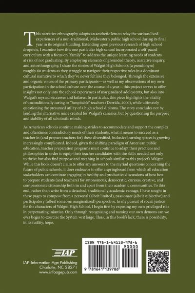 This narrative ethnography adopts an aesthetic lens to relay the various lived experiences of a non-traditional, Midwestern public high school during its final year in its original building. Extending upon previous research of high school dropouts, I examine how this one particular high school incorporated a self-paced curriculum with a focus on "family" to address the unique learning needs of students at risk of not graduating. By employing elements of grounded theory, narrative inquiry, and autoethnography, I share the stories of Walgut High School's (a pseudonym) roughly sixty students as they struggle to navigate their respective roles in a dominant cultural narrative to which they've never felt like they belonged. Through the extensive and organic voices of the primary participants-as well as my observations of my own participation in the school culture over the course of a year-this project serves to offer insights not only into the school experiences of marginalized adolescents, but also into Walgut's myriad successes and failures. In particular, this piece highlights the vitality of unconditionally caring or "hospitable" teachers (Derrida, 2000), while ultimately questioning the presumed utility of a high school diploma. The story concludes not by lauding the alternative mine created for Walgut's canaries, but by questioning the purpose and stability of all scholastic minds. As American schools continue making strides to accommodate and support the complex and oftentimes contradictory needs of their students, what it means to succeed as a teacher in (and prepare teachers for) these diversified, inclusive learning spaces is growing increasingly complicated. Indeed, given the shifting paradigm of American public education, teacher preparation programs must continue to adapt their practices and philosophies in order to equip their teacher candidates with the skills needed not only to thrive but also find purpose and meaning in schools similar to this project's Walgut. While this book doesn't claim to offer any answers to the myriad questions concerning the future of public schools, it does endeavor to offer a springboard from which all education stakeholders can continue engaging in healthy and productive discussions of how best to prepare students (and teachers) for autonomous, democratic, curious, creative, and compassionate citizenship both in and apart from their academic communities. To this end, rather than write from a detached, traditionally academic vantage, I have sought in these pages to compose from a personal (albeit limited), passionate (albeit subjective) and participatory (albeit someone marginalized) perspective. In my pursuit of social justice for the characters of Walgut High School, I begin first by exposing my own privileged role in perpetuating injustice. Only through recognizing and naming our own demons can we ever begin to exorcize the System writ large. Thus, in this book's lack, there is possibility; in its futility, hope.