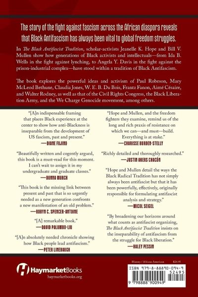 The story of the fight against fascism across the African diaspora, revealing that Black antifascism has always been vital to global freedom struggles. At once a history for understanding fascism and a handbook for organizing against, The Black Antifascist Tradition is an essential book for understanding our present moment and the challenges ahead. From London to the Caribbean, from Ethiopia to Harlem, from Black Lives Matter to abolition, Black radicals and writers have long understood fascism as a threat to the survival of Black people around the world-and to everyone. In The Black Antifascist Tradition, scholar-activists Jeanelle K. Hope and Bill Mullen show how generations of Black activists and intellectuals-from Ida B. Wells in the fight against lynching, to Angela Y. Davis in the fight against the prison-industrial complex-have stood within a tradition of Black Antifascism. As Davis once observed, pointing to the importance of anti-Black racism in the development of facism as an ideology, Black people have been "the first and most deeply injured victims of fascism." Indeed, the experience of living under and resisting racial capitalism has often made Black radicals aware of the potential for fascism to take hold long before others understood this danger. The book explores the powerful ideas and activism of Paul Robeson, Mary McLeod Bethune, Claudia Jones, W. E. B. Du Bois, Walter Rodney, Frantz Fanon, Aime Cesaire, and Walter Rodney, as well as that of the Civil Rights Congress, the Black Liberation Army, and the We Charge Genocide movement, among others. In shining a light on fascism and anti-Blackness, Hope and Mullen argue, the writers and organizers featured in this book have also developed urgent tools and strategies for overcoming it.