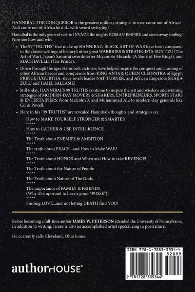 HANNIBAL THE CONQUEROR is the greatest military strategist to ever come out of Africa! And come out of Africa he did...with sword swinging! Hannibal is the only general ever to INVADE the mighty ROMAN EMPIRE and come away smiling! Now see how and why: ¿ The 99 "TRUTHS" that make up HANNIBAL's BLACK ART OF WAR have been compared to the classic writings of history's other great WARRIORS & STRATEGISTS: SUN TZU (The Art of War), Japan's Samurai swordmaster Miyamoto Musashi (A Book of Five Rings), and MACHIAVELLI (The Prince). ¿ Down through the ages Hannibal's victories have helped inspire the conquest and cunning of other African heroes and conquerors from KING ANTAR; QUEEN CLEOPATRA of Egypt; PRINCE JUGURTHA, slave revolt leader NAT TURNER, and African Emperors SHAKA ZULU and HAILE SALLASIE! ¿ Still today, HANNIBAL'S 99 TRUTHS continue to inspire the wit and wisdom and winning strategies of MODERN-DAY MOVERS & SHAKERS, ENTREPRENEURS, SPORTS STARS & ENTERTAINERS: from Malcolm X and Muhammad Ali, to modern-day generals like Colin Powell. ¿Here in his "99 TRUTHS" are revealed Hannibal's thoughts and strategies on: How to MAKE YOURSELF STRONGER & SMARTER ***** How to GATHER & USE INTELLIGENCE ***** The Truth about ENEMIES & AMBITION ***** The truth about PEACE...and How to Make WAR! ***** The Truth about HONOR and When and How to take REVENGE! ***** The Truth about the Nature of People ***** The Truth about Nature of The Gods ***** The importance of FAMILY & FRIENDS (Why it's important to have a good "POSSE"!) ***** Finding LOVE...and not letting DEATH find YOU!