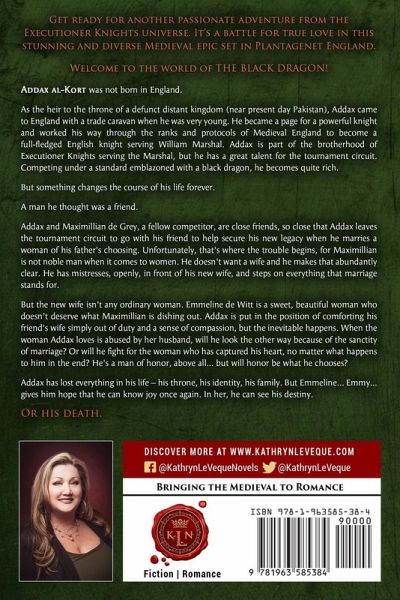 Get ready for another passionate adventure from the Executioner Knights universe. It's a battle for true love in this stunning and diverse Medieval epic set in Plantagenet England. Welcome to the world of THE BLACK DRAGON! Addax al-Kort was not born in England. As the heir to the throne of a defunct distant kingdom (near present day Pakistan), Addax came to England with a trade caravan when he was very young. He became a page for a powerful knight and worked his way through the ranks and protocols of Medieval England to become a full-fledged English knight serving William Marshal. Addax is part of the brotherhood of Executioner Knights serving the Marshal, but he has a great talent for the tournament circuit. Competing under a standard emblazoned with a black dragon, he becomes quite rich. But something changes the course of his life forever. A man he thought was a friend. Addax and Maximillian de Grey, a fellow competitor, are close friends, so close that Addax leaves the tournament circuit to go with his friend to help secure his new legacy when he marries a woman of his father's choosing. Unfortunately, that's where the trouble begins, for Maximillian is not noble man when it comes to women. He doesn't want a wife and he makes that abundantly clear. He has mistresses, openly, in front of his new wife, and steps on everything that marriage stands for. But the new wife isn't any ordinary woman. Emmeline de Witt is a sweet, beautiful woman who doesn't deserve what Maximillian is dishing out. Addax is put in the position of comforting his friend's wife simply out of duty and a sense of compassion, but the inevitable happens. When the woman Addax loves is abused by her husband, will he look the other way because of the sanctity of marriage? Or will he fight for the woman who has captured his heart, no matter what happens to him in the end? He's a man of honor, above all... but will honor be what he chooses? Addax has lost everything in his life - his throne, his identity, his family. But Emmeline... Emmy... gives him hope that he can know joy once again. In her, he can see his destiny. Or his death. Don't miss this rip-roaring Executioner Knight romance!