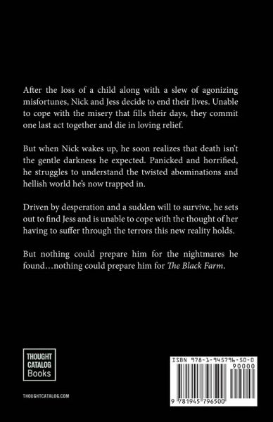 After the loss of a child along with a slew of agonizing misfortunes, Nick and Jess decide to end their lives. Unable to cope with the misery that fills their days, they commit one last act together and die in loving relief. But when Nick wakes up, he soon realizes that death isn't the gentle darkness he expected. Panicked and horrified, he struggles to understand the twisted abominations and hellish world he's now trapped in. Driven by desperation and a sudden will to survive, he sets out to find Jess and is unable to cope with the thought of her having to suffer through the terrors this new reality holds. But nothing could prepare him for the nightmares he found...nothing could prepare him for The Black Farm.
