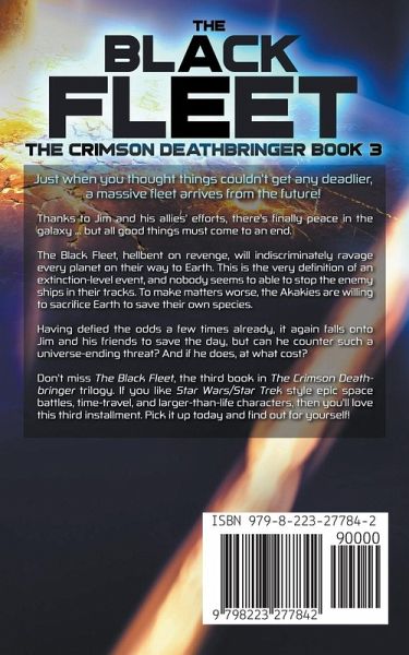 Just when you thought things couldn't get any deadlier, a massive fleet arrives from the future! Thanks to Jim and his allies' efforts, there's finally peace in the galaxy … but all good things must come to an end. The Black Fleet, hellbent on revenge, will indiscriminately ravage every planet on its way to Earth. This is the very definition of an extinction-level event, and nobody seems to be able to stop the enemy ships in their tracks. To make matters worse, the Akakies are willing to sacrifice Earth to save their own species. Having defied the odds a few times already, it again falls onto Jim and his friends to save the day, but can he counter such a universe-ending threat? And if he does, at what cost? Don't miss The Black Fleet, the third book in The Crimson Deathbringer series. If you like Star Wars/Star Trek style epic space battles, time travel, and larger-than-life characters, then you'll love this third installment. Pick it up today and find out for yourself!