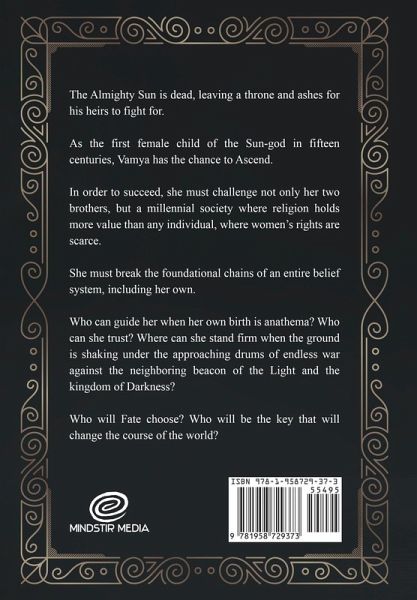 The Almighty Sun is dead, leaving a throne and ashes for his heirs to fight for. As the first female child of the Sun-god in fifteen centuries, Vamya has the chance to Ascend. In order to succeed, she must challenge not only her two brothers, but a millennial society where religion holds more value than any individual, where women's rights are scarce. She must break the foundational chains of an entire belief system, including her own. Who can guide her when her own birth is anathema? Who can she trust? Where can she stand firm when the ground is shaking under the approaching drums of endless war against the neighboring beacon of the Light and the kingdom of Darkness? Who will Fate choose? Who will be the key that will change the course of the world?