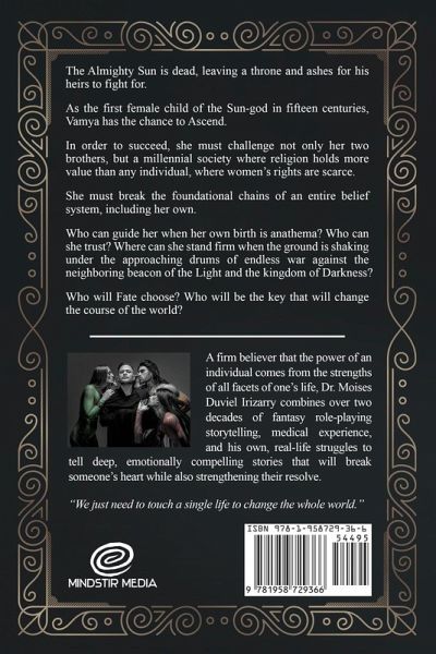 The Almighty Sun is dead, leaving a throne and ashes for his heirs to fight for. As the first female child of the Sun-god in fifteen centuries, Vamya has the chance to Ascend. In order to succeed, she must challenge not only her two brothers, but a millennial society where religion holds more value than any individual, where women's rights are scarce. She must break the foundational chains of an entire belief system, including her own. Who can guide her when her own birth is anathema? Who can she trust? Where can she stand firm when the ground is shaking under the approaching drums of endless war against the neighboring beacon of the Light and the kingdom of Darkness? Who will Fate choose? Who will be the key that will change the course of the world?
