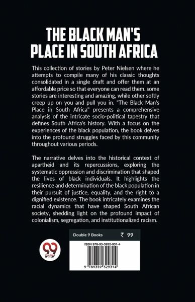 This collection of stories by Peter Nielsen where he attempts to compile many of his classic thoughts consolidated in a single draft and offer them at an affordable price so that everyone can read them. some stories are interesting and amazing, while other softly creep up on you and pull you in. "The Black Man's Place in South Africa" presents a comprehensive analysis of the intricate socio-political tapestry that defines South Africa's history. With a focus on the experiences of the black population, the book delves into the profound struggles faced by this community throughout various periods. The narrative delves into the historical context of apartheid and its repercussions, exploring the systematic oppression and discrimination that shaped the lives of black individuals. It highlights the resilience and determination of the black population in their pursuit of justice, equality, and the right to a dignified existence. The book intricately examines the racial dynamics that have shaped South African society, shedding light on the profound impact of colonialism, segregation, and institutionalized racism.