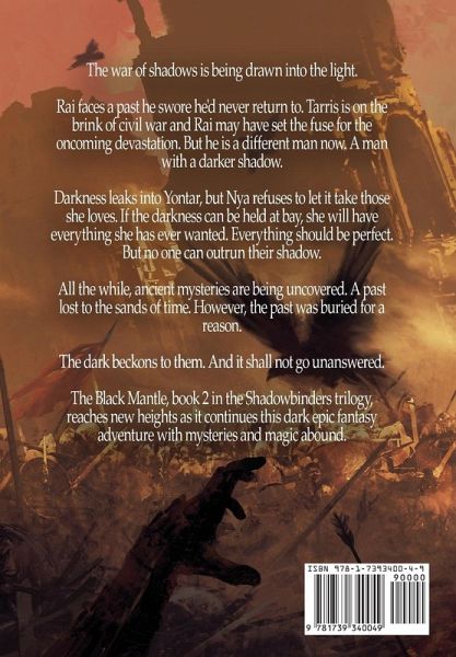 The war of shadows is being drawn into the light. Rai faces a past he swore he'd never return to. Tarris is on the brink of civil war and Rai may have set the fuse for the oncoming devastation. But he is a different man now. A man with a darker shadow. Darkness leaks into Yontar, but Nya refuses to let it take those she loves. If the darkness can be held at bay, she will have everything she has ever wanted. Everything should be perfect. But no one can outrun their shadow. All the while, ancient mysteries are being uncovered. A past lost to the sands of time. However, the past was buried for a reason. The dark beckons to them. And it shall not go unanswered. The Black Mantle, book 2 in the Shadowbinders trilogy, reaches new heights as it continues this dark epic fantasy adventure with mysteries and magic abound.