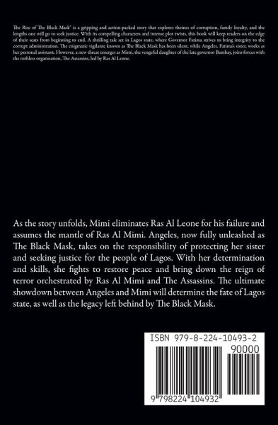 The Rise of The Black Mask" is a gripping and action-packed story that explores themes of corruption, family loyalty, and the lengths one will go to seek justice. With its compelling characters and intense plot twists, this book will keep readers on the edge of their seats from beginning to end. A thrilling tale set in Lagos state, where Governor Fatima strives to bring integrity to the corrupt administration. The enigmatic vigilante known as The Black Mask has been silent, while Angeles, Fatima's sister, works as her personal assistant. However, a new threat emerges as Mimi, the vengeful daughter of the late governor Bambay, joins forces with the ruthless organisation, The Assassins, led by Ras Al Leone. Their mission is to wreak havoc and lure out The Black Mask for revenge. As the people of Lagos hold vigil for their protector's return, Angeles must decide whether to trust her sister or take matters into her own hands. The city of Lagos is plunged into chaos as Mimi and Ras Al Leone carry out their crimes, chaos, and murders. The citizens anxiously await The Rise of The Black Mask, hoping for peace and justice. Meanwhile, Angeles puts her faith in Governor Fatima's ability to handle the situation. However, everything changes when Governor Fatima is brutally attacked by Mimi, Ras Al Leone, and The Assassins. Left for dead, Fatima's life hangs in the balance, and Angeles is compelled to step into her alter ego as The Black Mask. With the goal of protecting her sister and restoring peace to Lagos, Angeles embarks on a dangerous battle against the forces of evil. As the story unfolds, Mimi eliminates Ras Al Leone for his failure and assumes the mantle of Ras Al Mimi. Angeles, now fully unleashed as The Black Mask, takes on the responsibility of protecting her sister and seeking justice for the people of Lagos. With her determination and skills, she fights to restore peace and bring down the reign of terror orchestrated by Ras Al Mimi and The Assassins. The ultimate showdown between Angeles and Mimi will determine the fate of Lagos state, as well as the legacy left behind by The Black Mask. In the aftermath, the city must rebuild and move forward, guided by Governor Fatima's vision and Angeles' The Black Mask enduring legacy.
