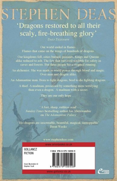 Two years have passed since the events of THE ORDER OF THE SCALES. Across the realms, dragons are still hatching. Hatching, and hatching free. Skorl is an Ember, a soldier trained from birth to fight dragons. He is a living weapon, one-shot only, saturated with enough dragon-poison to bring down a monster all on his own. Misanthrope, violent and a drunk, to fulfil his purpose and slay a dragon, means to be eaten. Now Skorl has a choice: he can hang for his crimes, or he can go with the last of the Adamantine Men, fighting against an enemy he was born to face. Rat is an Outsider. He's on the run and he's stumbled onto something that's going to make him rich beyond all his dreams. It's just a shame that the end of the world has started without him. Kataros is an alchemist, one of the order responsible for keeping the dragons in check. One of the order that has just failed, and disastrously so. Two men, one woman. One chance to save the world from a storm of dragons ...