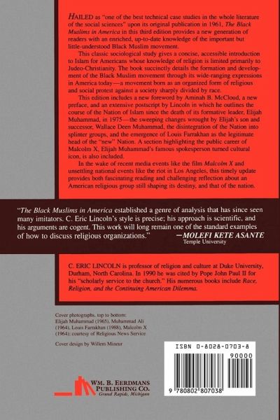 This is a print on demand book and is therefore non- returnable. Hailed as "one of the best technical case studies in the whole literature of the social sciences" upon its original publication in 1961, The Black Muslims in America in this third edition provides a new generation of readers with an enriched, up-to-date knowledge of the important but little- understood Black Muslim movement. This classic sociological study gives a concise, accessible introduction to Islam for Americans whose knowledge of religion is limited primarily to Judeo-Christianity. The book succinctly details the formation and development of the Black Muslim movement through its wide-ranging expressions in America today — a movement born as an organized form of religious and social protest against a society sharply divided by race. This edition includes a new foreword by Aminah B. McCloud, a new preface, and an extensive postscript by Lincoln in which he outlines the course of the Nation of Islam since the death of its formative leader, Elijah Muhammad, in 1975 — the sweeping changes wrought by Elijah's son and successor, Wallace Deen Muhammad, the disintegration of the Nation into splinter groups, and the emergence of Louis Farrakhan as the legitimate head of the "new" Nation. A section highlighting the public career of Malcolm X, Elijah Muhammad's famous spokesperson turned cultural icon, is also included. In the wake of recent media events like the film Malcolm X and unsettling national events like the riot in Los Angeles, this timely update provides both fascinating reading and challenging reflection about an American religious group still shaping its destiny, and that of the nation.