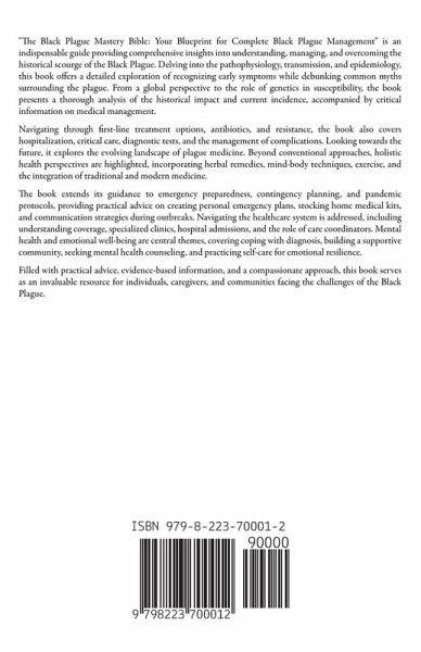 "The Black Plague Mastery Bible: Your Blueprint for Complete Black Plague Management" is an indispensable guide providing comprehensive insights into understanding, managing, and overcoming the historical scourge of the Black Plague. Delving into the pathophysiology, transmission, and epidemiology, this book offers a detailed exploration of recognizing early symptoms while debunking common myths surrounding the plague. From a global perspective to the role of genetics in susceptibility, the book presents a thorough analysis of the historical impact and current incidence, accompanied by critical information on medical management. Navigating through first-line treatment options, antibiotics, and resistance, the book also covers hospitalization, critical care, diagnostic tests, and the management of complications. Looking towards the future, it explores the evolving landscape of plague medicine. Beyond conventional approaches, holistic health perspectives are highlighted, incorporating herbal remedies, mind-body techniques, exercise, and the integration of traditional and modern medicine. The book extends its guidance to emergency preparedness, contingency planning, and pandemic protocols, providing practical advice on creating personal emergency plans, stocking home medical kits, and communication strategies during outbreaks. Navigating the healthcare system is addressed, including understanding coverage, specialized clinics, hospital admissions, and the role of care coordinators. Mental health and emotional well-being are central themes, covering coping with diagnosis, building a supportive community, seeking mental health counseling, and practicing self-care for emotional resilience. Filled with practical advice, evidence-based information, and a compassionate approach, this book serves as an invaluable resource for individuals, caregivers, and communities facing the challenges of the Black Plague.