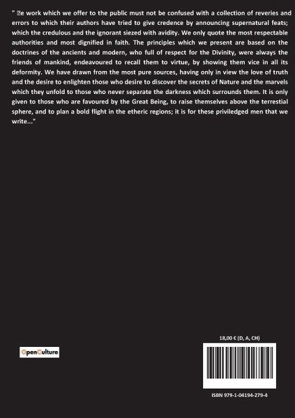 " ¿e work which we offer to the public must not be confused with a collection of reveries and errors to which their authors have tried to give credence by announcing supernatural feats; which the credulous and the ignorant siezed with avidity. We only quote the most respectable authorities and most dignified in faith. The principles which we present are based on the doctrines of the ancients and modern, who full of respect for the Divinity, were always the friends of mankind, endeavoured to recall them to virtue, by showing them vice in all its deformity. We have drawn from the most pure sources, having only in view the love of truth and the desire to enlighten those who desire to discover the secrets of Nature and the marvels which they unfold to those who never separate the darkness which surrounds them. It is only given to those who are favoured by the Great Being, to raise themselves above the terrestial sphere, and to plan a bold flight in the etheric regions; it is for these priviledged men that we write..."