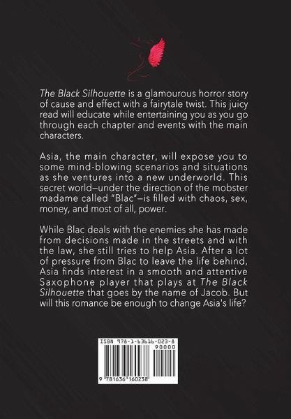 The Black Silhouette is a glamourous horror story of cause and effect with a fairytale twist. This juicy read will educate while entertaining you as you go through each chapter and events with the main characters. Asia, the main character, will expose you to some mind-blowing scenarios and situations as she ventures into a new underworld. This secret world-under the direction of the mobster madame called "Blac"-is filled with chaos, sex, money, and most of all, power. While Blac deals with the enemies she has made from decisions made in the streets and with the law, she still tries to help Asia. After a lot of pressure from Blac to leave the life behind, Asia finds interest in a smooth and attentive Saxophone player that plays at The Black Silhouette that goes by the name of Jacob. But will this romance be enough to change Asia's life